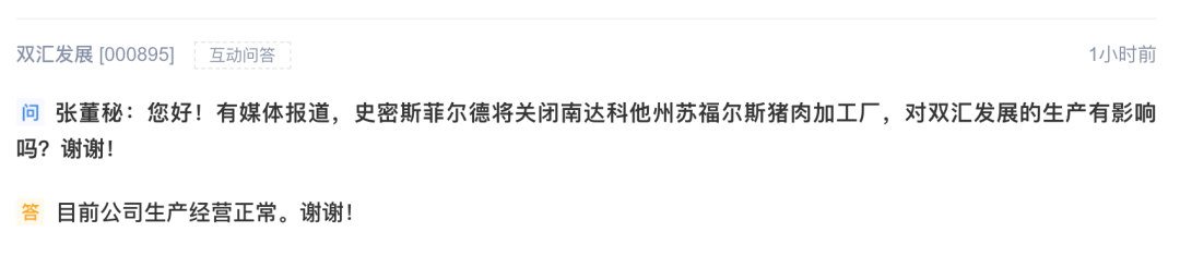 今日,再度有投资者提问,双汇发展仍表示:“目前生产经营正常。”